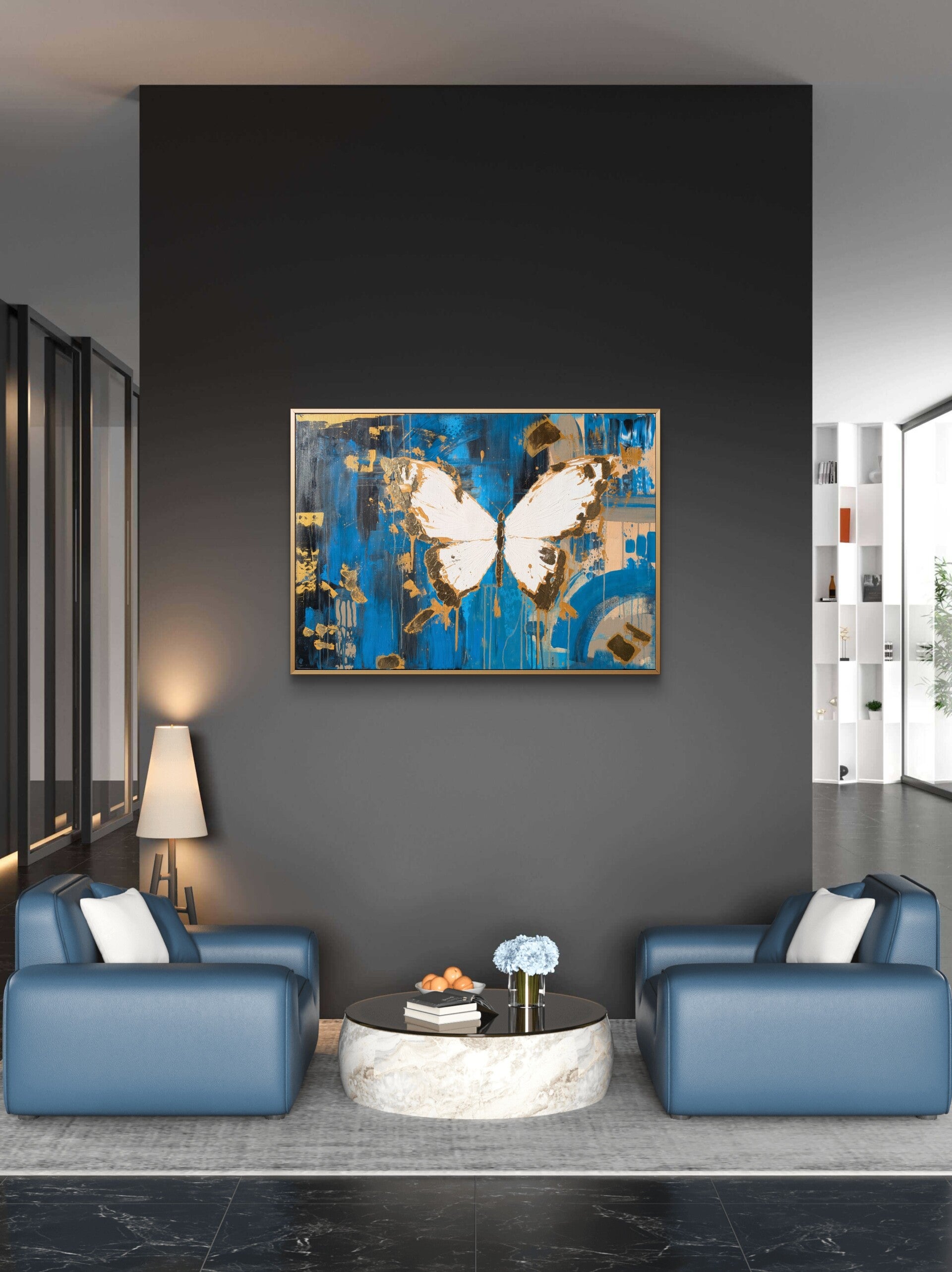 Acrylarbeit mit Blattgold auf Canvas inklusive Schattenfugenrahmen in gold.